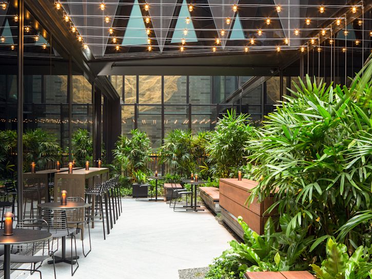 In the centre of the hotel you’ll find a stunning open-air “jungle” with luscious foliage and sparkling festoon lights. It’s the perfect place to escape the business of the city and have a drink, catch up on some work, or simply relax and spend a moment.
